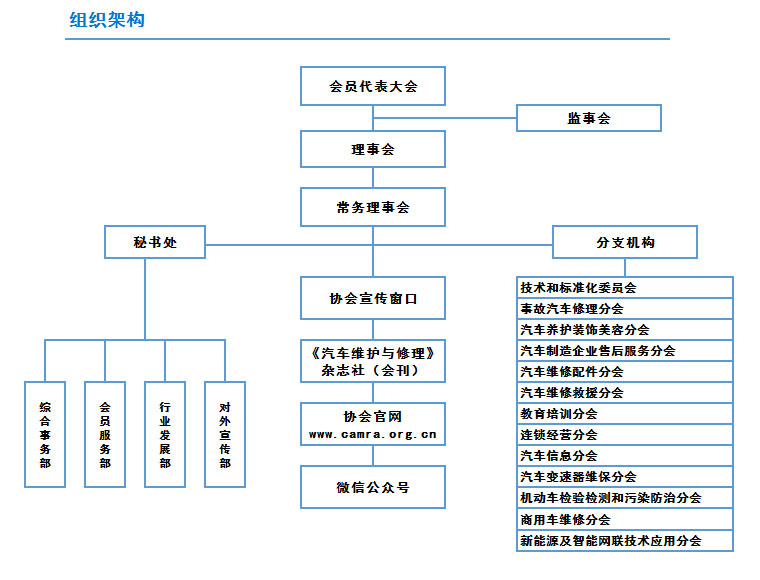 協(xié)會最高權(quán)力機(jī)構(gòu)是會員代表大會,理事會是會員代表大會的執(zhí)行機(jī)構(gòu),秘書處為協(xié)會常設(shè)辦事機(jī)構(gòu)。秘書處下設(shè)綜合事務(wù)部、會員服務(wù)部、行業(yè)發(fā)展部和對外宣傳部等4個(gè)部門。分支機(jī)構(gòu)是協(xié)會的重要組成部分,在協(xié)會的領(lǐng)導(dǎo)下開展各項(xiàng)業(yè)務(wù)活動。協(xié)會成立了技術(shù)和標(biāo)準(zhǔn)化委員會、教育培訓(xùn)分會、機(jī)動車檢驗(yàn)檢測和污染防治分會、事故汽車修理分會、汽車養(yǎng)護(hù)裝飾美容分會、汽車制造企業(yè)售后服務(wù)分會、汽車維修救援分會、汽車維修配件分會、連鎖經(jīng)營分會、汽車信息分會、汽車變速器維保分會、商用車維修分會等12個(gè)分支機(jī)構(gòu),并主辦了《汽車維護(hù)與修理》雜志,作為自己的會刊。協(xié)會會員包括團(tuán)體和個(gè)人會員,遍及全國各地,涵蓋汽車維修、整車生產(chǎn)、配件及裝備制造、科研院所、大專院校、金融保險(xiǎn)及互聯(lián)網(wǎng)等相關(guān)領(lǐng)域。目前我會會員數(shù)已超過1500家。