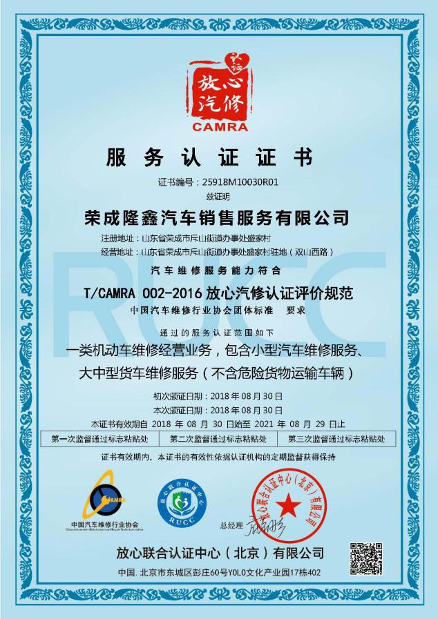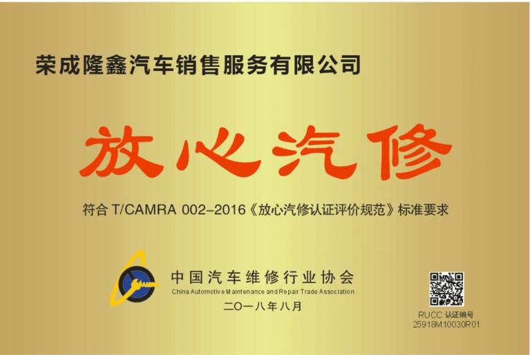 崔總說:“榮成隆鑫通過放心汽修認證,幫助企業(yè)提高管理能力、提升服務(wù)水平、保證維修質(zhì)量、增強了客戶體驗。”為榮成碧海藍天做出自己應(yīng)有貢獻。