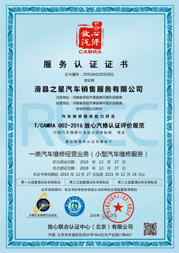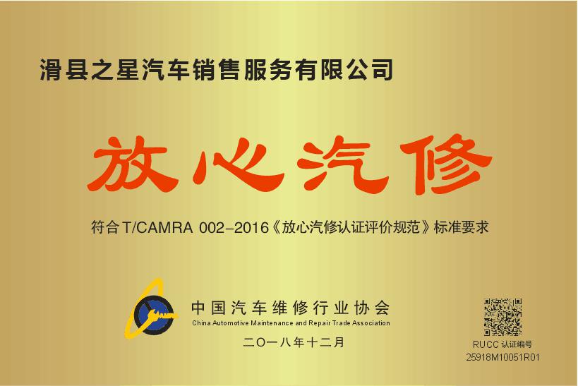 放心汽修認(rèn)證證書