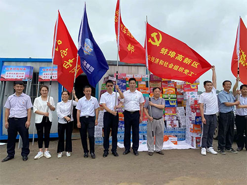 7月24日17:40,淮河干流王家壩至盱眙段全線超警戒水位,荊山湖行蓄洪區(qū)開閘蓄洪。緊臨荊山湖行蓄洪區(qū)的懷遠(yuǎn)縣常墳鎮(zhèn)張溝村,是高新區(qū)管委會脫貧攻堅(jiān)對口幫扶對象。此次蓄洪僅張溝村被淹水稻、大豆、西瓜等農(nóng)作物近5000畝,村“兩委”自蓄洪以來,第一時間組織黨員干部、志愿者等24小時堅(jiān)守防汛大堤。得知這一情況后,虹亞集團(tuán)、航天生物、高新?lián)H曳枪髽I(yè)黨組織積極捐款捐物,在區(qū)組織部、勞動監(jiān)察大隊(duì)負(fù)責(zé)同志帶領(lǐng)下,驅(qū)車40公里,慰問駐守在荊山湖行蓄洪區(qū)防汛大堤一線的防汛值守人員。
