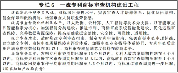 提高知識產(chǎn)權審查質(zhì)量和審查效率。完善適應創(chuàng)新發(fā)展需求的知識產(chǎn)權審查管理體系,優(yōu)化專利、商標審查協(xié)作機制。提升專利商標審查機構能力水平,強化專利、商標、版權、地理標志、植物新品種全流程審查質(zhì)量管控,提升知識產(chǎn)權授權確權質(zhì)量。提高專利、商標審查業(yè)務精細化管理水平,優(yōu)化審查資源配置,加強智能化技術運用,提升審查效能,縮短審查周期。完善專利、商標審查模式,加強審查與產(chǎn)業(yè)發(fā)展的政策協(xié)同和業(yè)務聯(lián)動,滿足產(chǎn)業(yè)綠色轉(zhuǎn)型和新領域新業(yè)態(tài)創(chuàng)新發(fā)展等社會多樣化需求。(中央宣傳部、工業(yè)和信息化部、農(nóng)業(yè)農(nóng)村部、國家林草局、國家知識產(chǎn)權局等按職責分工負責)