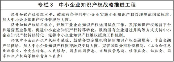積極穩(wěn)妥發(fā)展知識產(chǎn)權金融。優(yōu)化知識產(chǎn)權質(zhì)押融資體系,健全知識產(chǎn)權質(zhì)押融資風險管理機制,完善質(zhì)物處置機制,建設知識產(chǎn)權質(zhì)押信息平臺。支持銀行創(chuàng)新內(nèi)部考核管理模式,推動銀行業(yè)金融機構用好單列信貸計劃和優(yōu)化不良率考核等監(jiān)管政策,在風險可控的前提下擴大知識產(chǎn)權質(zhì)押貸款規(guī)模。鼓勵知識產(chǎn)權保險、信用擔保等金融產(chǎn)品創(chuàng)新,充分發(fā)揮金融支持知識產(chǎn)權轉(zhuǎn)化的作用。在自由貿(mào)易試驗區(qū)和自由貿(mào)易港推進知識產(chǎn)權金融服務創(chuàng)新。健全知識產(chǎn)權價值評估體系,鼓勵開發(fā)智能化知識產(chǎn)權評估工具。(國家知識產(chǎn)權局牽頭,中央宣傳部、國家發(fā)展改革委、財政部、人民銀行、銀保監(jiān)會、證監(jiān)會等按職責分工負責)