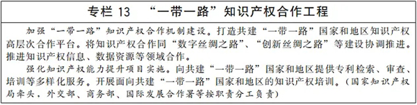 加強知識產(chǎn)權國際合作機制建設。鞏固和完善“一帶一路”知識產(chǎn)權合作,充分利用“一帶一路”知識產(chǎn)權合作平臺,擴大合作項目規(guī)模和儲備。深度參與金磚國家、中美歐日韓、中日韓、中國—東盟等小多邊知識產(chǎn)權合作,加強與各方政策和業(yè)務規(guī)則交流,支持產(chǎn)業(yè)界積極參與相關合作機制。完善跨境司法協(xié)作安排,加強防范打擊侵犯知識產(chǎn)權犯罪國際合作。(中央宣傳部、最高人民法院、最高人民檢察院、外交部、公安部、商務部、海關總署、國家知識產(chǎn)權局等按職責分工負責)