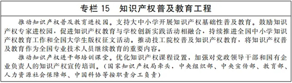 優(yōu)化知識產(chǎn)權人才發(fā)展環(huán)境。推進知識產(chǎn)權學科建設,支持學位授權自主審核單位依程序設置知識產(chǎn)權一級學科點,支持有關單位依程序設置知識產(chǎn)權二級學科點,研究設置知識產(chǎn)權碩士專業(yè)學位。推動知識產(chǎn)權相關專業(yè)升級和數(shù)字化改造,開發(fā)一批知識產(chǎn)權精品課程。鼓勵支持有條件的理工科高校開設知識產(chǎn)權相關專業(yè)和課程。設立一批國家知識產(chǎn)權人才培養(yǎng)基地。做好知識產(chǎn)權職稱制度改革實施工作,完善知識產(chǎn)權人才評價體系。(教育部、人力資源社會保障部、國家知識產(chǎn)權局等按職責分工負責)