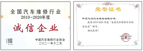 2021年獲得“2019-2020年度全國(guó)汽車維修行業(yè)誠(chéng)信企業(yè)”稱號(hào),并頒發(fā)榮譽(yù)證書(shū)及獎(jiǎng)牌;