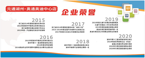 湖州奧通位于湖州市杭長橋北路988號,建筑面積達(dá)7510平方米,集整車銷售、服務(wù)、零配件銷售、信息回訪為一體的標(biāo)準(zhǔn)4S展廳。公司以誠信、專業(yè)、嚴(yán)謹(jǐn)、關(guān)愛的服務(wù)理念,16年來擁有33765位奧迪車主,提供超過31萬次車輛服務(wù)。榮獲2010、2012、2013、2014、2016、2018、2020年度“湖州市消費(fèi)者信得過單位”稱號,2015、2016年度“全國汽車維修行業(yè)誠信企業(yè)”稱號,2017年度“浙江省放心消費(fèi)示范店”稱號,2019年度“優(yōu)秀維修企業(yè)(4S店)”稱號。