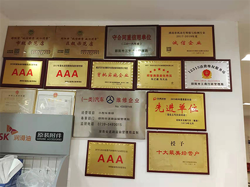 多次獲得省級、市區(qū)AAA企業(yè),邵陽市誠信經(jīng)營放心消費市級示范店,十大最美經(jīng)營戶,12315消費者維權(quán)服務(wù)站,一類汽車維修企業(yè),并獲得上汽大眾的顧客滿意度經(jīng)銷商稱號。