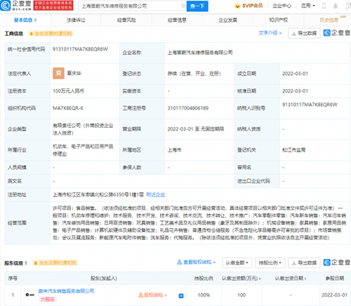3月1日,上海首蔚汽車維修服務(wù)有限公司成立,法定代表人為夏慶華,注冊(cè)資本100萬(wàn)元人民幣,經(jīng)營(yíng)范圍包含:新能源汽車電附件銷售;洗車服務(wù);代駕服務(wù)等。企查查股權(quán)穿透顯示,該公司由蔚來(lái)汽車銷售服務(wù)有限公司100%控股。