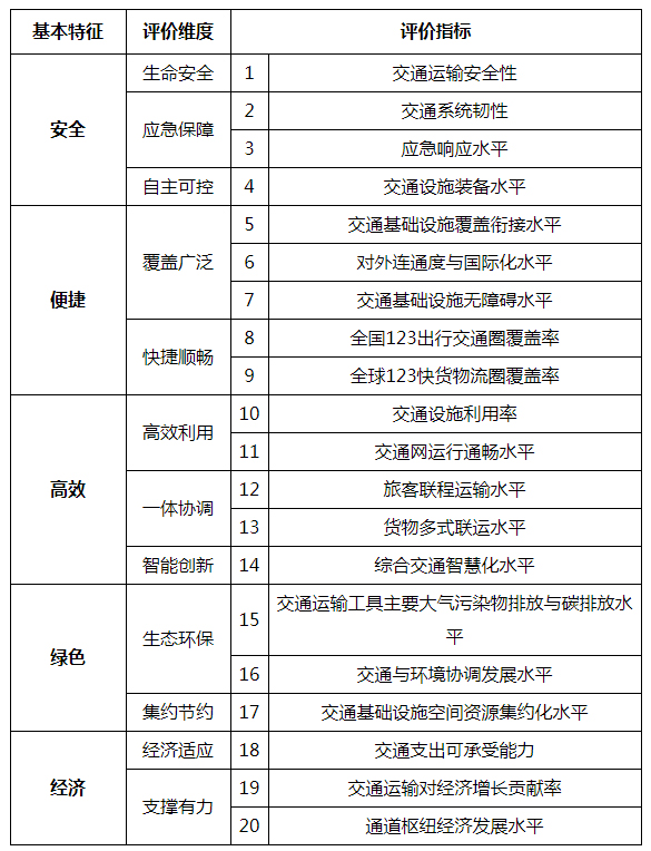 綜合考慮各地區(qū)、各行業(yè)特點(diǎn),注重交通運(yùn)輸與經(jīng)濟(jì)社會(huì)、生態(tài)環(huán)境相協(xié)調(diào),統(tǒng)籌發(fā)展和安全,圍繞“安全、便捷、高效、綠色、經(jīng)濟(jì)”,從“基本特征、評(píng)價(jià)維度、評(píng)價(jià)指標(biāo)”三級(jí)設(shè)置20項(xiàng)評(píng)價(jià)指標(biāo)。相應(yīng)設(shè)置部分表征指標(biāo),供行業(yè)、地方制定指標(biāo)參考,具體見(jiàn)附件