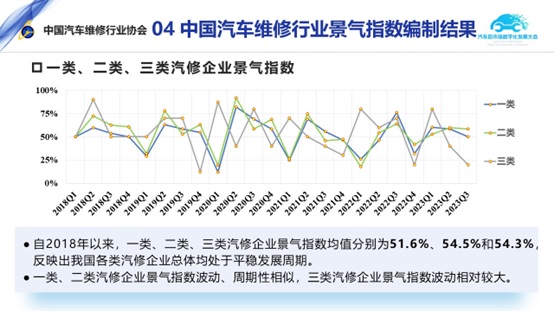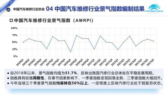 AMRPI指數(shù)以季度為衡量周期,采用擴散指數(shù)法編制,現(xiàn)階段以汽修企業(yè)進場臺次為基礎(chǔ)性指標,從全國汽車維修行業(yè)ERP供應(yīng)商和地方行業(yè)協(xié)會等渠道選取數(shù)千家連續(xù)經(jīng)營5年以上汽修企業(yè)為樣本,包括一、二、三類汽修企業(yè),地區(qū)分布較均衡,樣本總體能夠代表行業(yè)的主流表現(xiàn)和整體趨勢。指數(shù)取值介于0至100%之間,50%為榮枯線,指數(shù)高于榮枯線,反映行業(yè)較上季度呈擴張或上升狀態(tài);低于榮枯線,則反映行業(yè)較上季度呈收縮或下降狀態(tài)。研究結(jié)果表明,我國汽車維修行業(yè)總體處于逐步向好的發(fā)展階段,在服務(wù)保障方面,能夠適應(yīng)和滿足車主多層次、多樣化、多品牌、多車型的維修消費需求。由于汽車保有量穩(wěn)步上升、保有車輛平均車齡上升等綜合因素,除個別區(qū)域和店面發(fā)展呈現(xiàn)不均衡狀況外,汽車維修行業(yè)總體運行狀態(tài)平穩(wěn)有升,2023年前三個季度景氣指數(shù)均保持在50%以上,這在一定程度上反映出汽車維修行業(yè)處于弱復蘇狀態(tài),且預期應(yīng)持續(xù)保持向好態(tài)勢。