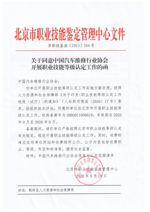 經(jīng)北京市職業(yè)技能鑒定管理中心備案,中國汽車維修行業(yè)協(xié)會獲準(zhǔn)開展職業(yè)技能等級認(rèn)定工作。