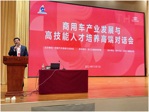 張延華作為主辦方致辭。他表示中國汽車維修行業(yè)協(xié)會自成立以來,高度重視汽車維修行業(yè)發(fā)展及行業(yè)人才隊伍建設,積極推動中國商用車企業(yè)與技工院校人才培養(yǎng)緊密聯(lián)系,為行業(yè)人才培養(yǎng)發(fā)揮積極作用。他強調(diào),商用車產(chǎn)業(yè)是國民經(jīng)濟不可或缺的組成部分,我國商用車市場是全球最大、最有發(fā)展?jié)摿Φ氖袌?,協(xié)會同樣高度重視商用車后市場發(fā)展,正在籌備成立商用車維修分會,并向人社部申請設立了商用車維修工新職業(yè)工種,推動制定商用車維修工國家職業(yè)技能標準,即將舉辦國家二類賽事——商用車維修職業(yè)技能競賽。他指出,浙江交通技師學院始終立足交通、服務交通,深化產(chǎn)教融合、校企合作,成為支撐汽車產(chǎn)業(yè)轉(zhuǎn)型升級和技術創(chuàng)新的重要力量。張會長希望大家充分利用這次難得的機會,就商用車產(chǎn)業(yè)發(fā)展、技術創(chuàng)新、市場需求以及高技能人才培養(yǎng)等關心的話題,展開深入交流探討,充分凝聚智慧,碰撞思想火花,謀劃新發(fā)展機遇,為產(chǎn)業(yè)技術創(chuàng)新、市場拓展以及推動產(chǎn)教深度融合注入強勁動力,為助力商業(yè)車產(chǎn)業(yè)和汽車維修業(yè)高質(zhì)量發(fā)展做出新的更大貢獻。
