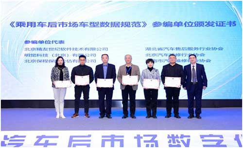 大會期間,舉行了團(tuán)體標(biāo)準(zhǔn)《乘用車后市場車型數(shù)據(jù)規(guī)范》發(fā)布儀式,底彥彬為部分參編單位頒發(fā)證書。北京精友世紀(jì)軟件技術(shù)有限公司副總經(jīng)理曹學(xué)軍代表編寫組進(jìn)行標(biāo)準(zhǔn)解讀。