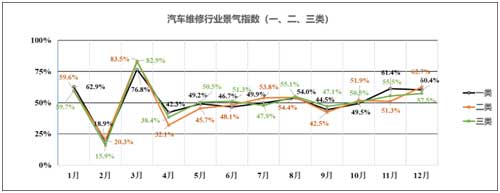 各類汽車維修企業(yè)景氣指數(shù)結果表明,10-12月,一、二、三類企業(yè)汽車維修行業(yè)景氣指數(shù)總體處于上升狀態(tài)。其中,一類、二類維修企業(yè)的上升幅度較大,分別提升了10.9、10.8個百分點,說明受季節(jié)因素影響,大修和總成修理、汽車維護需求明顯增加;同時,三類維修企業(yè)也有一定程度的上升,表明整個汽車維修行業(yè)在四季度的經(jīng)營形勢持續(xù)向好。