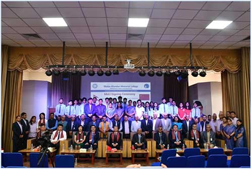張延華會(huì)長(zhǎng)一行與班達(dá)里學(xué)院師生在簽約儀式上合影