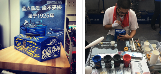 此次展會,藍(lán)點邀請了來自日本的彩繪師出牛泉先生一起跨界合作,現(xiàn)場打造個性藍(lán)點產(chǎn)品。出牛先生擅長在各類產(chǎn)品上用顏料繪出精美的圖案,曾為很多改裝廠家設(shè)計過各類車身彩繪,并大受好評?;顒蝇F(xiàn)場,出牛先生即興在藍(lán)點工具箱上繪出圖案,讓“冷冰冰”的鋼板結(jié)構(gòu)瞬間變得“柔性”起來,讓普通的工具箱不再平凡,并擁有了自己獨特的“個性”?!白兩怼焙蟮乃{(lán)點產(chǎn)品,引來現(xiàn)場無數(shù)觀眾駐足參觀,感嘆工具還能這么玩?!