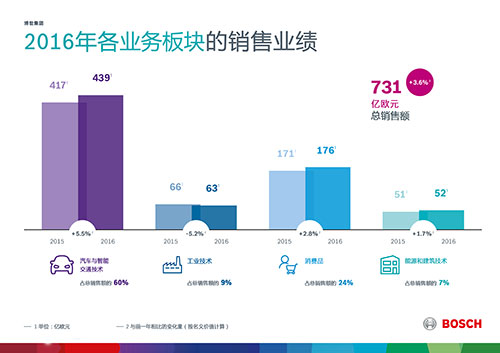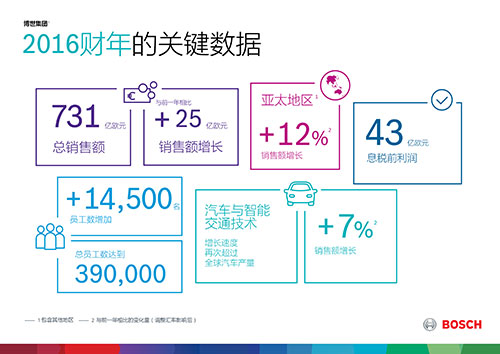 2016年,博世集團的總銷售額增長3.6%,達731億歐元。除去匯率因素影響后,增長率為5.5%,匯率對博世集團銷售額的負面影響達13億歐元。集團息稅前利潤達到43億歐元,息稅前利潤率達到5.8%。業(yè)績表現(xiàn)和盈利狀況反映了集團為保障未來發(fā)展所作的大量前期投資。去年,博世在研發(fā)領(lǐng)域的投資提高將近10%,達到70億歐元。博世集團首席財務(wù)官兼董事會副主席Stefan博士解釋道:“在博世轉(zhuǎn)型過程中,既要做相當大的前期投資,同時也要保障長期的高利潤率?!闭{(diào)整匯率負面影響后的2016年集團息稅前利潤為33億歐元。