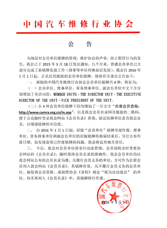 中國(guó)汽車維修行業(yè)協(xié)會(huì)關(guān)于啟用新版會(huì)員單位銘牌的公告