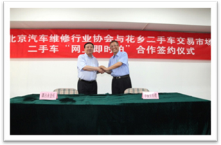 2015年7月10日下午,在北京汽修行業(yè)協(xié)會(huì)會(huì)議室,北京汽車維修行業(yè)協(xié)會(huì)譚占永會(huì)長(zhǎng)與全國(guó)最大的二手車交易市場(chǎng)---北京花鄉(xiāng)二手車市場(chǎng)李振生經(jīng)理正式簽訂合作協(xié)議,向北京汽修行業(yè)協(xié)會(huì)會(huì)員單位免費(fèi)開(kāi)展“二手車網(wǎng)上即時(shí)拍”服務(wù)。當(dāng)場(chǎng)有北京首汽修理公司、北京天木汽車修理公司等10家第一批申請(qǐng)的會(huì)員單位和花鄉(xiāng)二手車市場(chǎng)簽了“二手車網(wǎng)上即時(shí)拍”的協(xié)議。協(xié)會(huì)53家常務(wù)理事單位和來(lái)自人民網(wǎng)、北京日?qǐng)?bào)、北京電臺(tái)等10余家媒體的記者共同參加了簽約儀式。