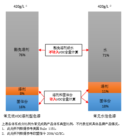 解 答:對于VOC的定義各方意見不一致,導(dǎo)致測定方法各異。以歐盟為代表的水性涂料扣水法和以美國加州地區(qū)Rule1151為代表的扣水扣豁免溶劑法。在符合美國加州法規(guī)Rule1151情況下,涂料供應(yīng)廠商理論上可以通過以豁免溶劑替代普通溶劑的方法實(shí)現(xiàn)溶劑型產(chǎn)品達(dá)標(biāo),在這種情況下,約占76%的豁免溶劑將不被計(jì)入產(chǎn)品VOC含量(見圖1左側(cè)柱狀條);但如需要符合歐盟指令2004/42/EC,則色漆必須改用水性漆,較傳統(tǒng)溶劑型色漆,約71%的溶劑被水所替代,大大降低了總體VOC含量(見圖1右側(cè)柱狀條)。由于美國加州法規(guī)Rule1151和歐盟指令2004/42/EC采取的測試方法不同,前者為扣水扣豁免溶劑法,后者為扣水法,故雖然同為420 g/L,歐盟指令下排除豁免溶劑并且扣水的測定方式是最嚴(yán)格VOC含量限值。所以,不是小于420 g/L的就是環(huán)保型涂料,要根據(jù)VOC的測試標(biāo)準(zhǔn)才能定義環(huán)保型涂料的標(biāo)準(zhǔn)。