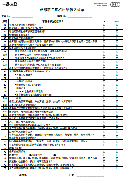 六、質(zhì)量檢查四道關(guān):維修小組自檢、維修小組互檢、質(zhì)檢員終檢、技術(shù)經(jīng)理抽檢。
