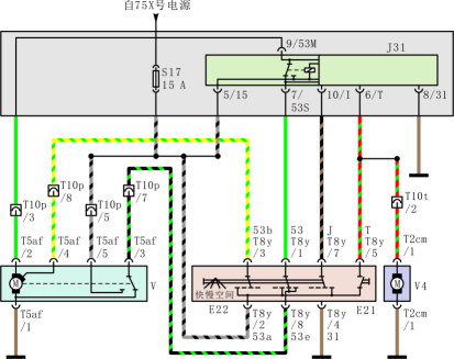 當E22處于OFF擋時,若刮水片尚未回到設定位置,V的復位電路起作用,V低速運轉(zhuǎn),直到刮水片回到設定位置,即V兩端均搭鐵,其控制電路為:75X號電源→熔絲S17→V端子T5af/5→V端子T5af/3→E22端子T8y/8→E22端子T8y/1→J31端子7/53S→J31內(nèi)部常閉觸點→J31端子9/53M→V端子T5af/2→V端子T5af/1→搭鐵。
