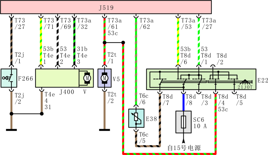 E22—刮水器開關(guān);E38—刮水器間歇運行調(diào)節(jié)器;F266—發(fā)動機室蓋接觸開關(guān);J400—刮水器電動機控制模塊;J519—車身控制模塊;V—刮水器電動機;V5—洗滌器電動機