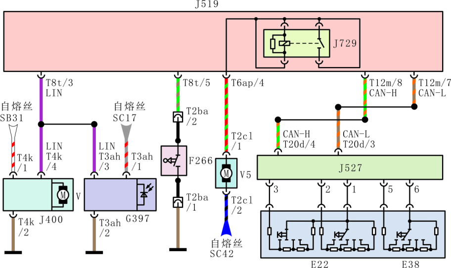 E22—刮水器開關(guān);E38—刮水器間歇運行調(diào)節(jié)器;F266—發(fā)動機室蓋接觸開關(guān);G397—雨量和光照識別傳感器;J400—刮水器電動機控制模塊;J519—車身控制模塊;J527—轉(zhuǎn)向柱控制模塊;J729—洗滌器電動機繼電器;V—刮水器電動機;V5—洗滌器電動機