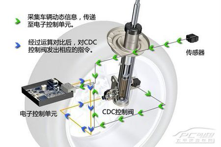 連續(xù)可變阻尼控制懸架控制系統(tǒng)又稱CDC(Continuous Damping Control)懸架控制系統(tǒng),屬于半主動(dòng)懸架控制系統(tǒng),其按照路面情況和行駛條件,利用電磁閥連續(xù)調(diào)節(jié)減振器的阻尼,以確保最佳的操控穩(wěn)定性和乘坐舒適性。該懸架控制系統(tǒng)在奇瑞瑞麒G6轎車及別克2009款君越轎車上有所應(yīng)用。