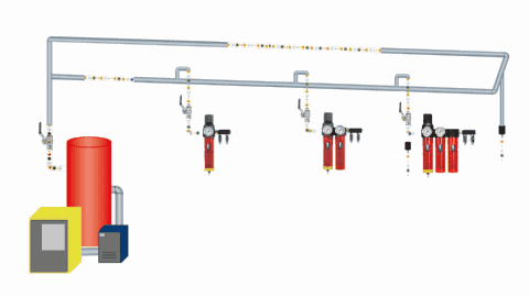 主管道應(yīng)呈環(huán)形回路,以保證每個(gè)支管路有充足的流量和穩(wěn)定的壓力,整個(gè)環(huán)形主管道應(yīng)呈約0.5-1%角度傾斜,以便在管道最低處安裝自動(dòng)排水閥,排出收集的冷凝物。