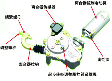 電動離合控制器的結(jié)構(gòu)如圖4所示。在安裝電動離合控制器時,確保電動離合控制器處于結(jié)合狀態(tài),旋轉(zhuǎn)調(diào)整螺栓改變螺栓的伸出長度,當(dāng)調(diào)整到完全消除分離軸承與分離爪的間隙后,再將調(diào)整螺栓旋緊一圈(向離合器分離杠桿方向),然后擰緊鎖緊螺母。離合器間隙調(diào)整后,用手拉離合器拉鉤,有拉彈簧的感覺,行程大于3 mm。