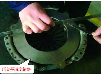 拆下變速器后檢查在裝配狀態(tài)下的壓盤,用深度尺測量各分離杠桿高度差,均小于標(biāo)準(zhǔn)極限差值(0.5 mm),且壓盤的膜片彈簧沒有發(fā)生斷裂;檢查分離軸承,不松曠,且端面沒有異常磨損;拆解離合器各執(zhí)行組件,進(jìn)一步檢查并未發(fā)現(xiàn)各執(zhí)行組件有明顯的燒蝕、油污等,目視觀察也沒有劃痕、刮蹭等痕跡;用深度尺測量從動盤鉚釘頭深度,在正常范圍內(nèi);用鋼板尺與塞尺配合檢測壓盤的平面度(圖8),為0.30 mm,大于標(biāo)準(zhǔn)值(0.20 mm),由此確定壓盤平面有翹曲。