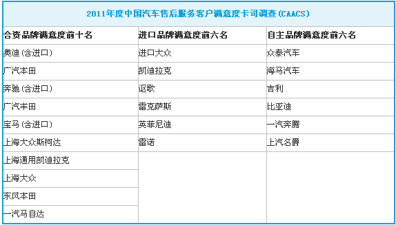 2012年11月16日,2011年度中國(guó)汽車(chē)售后服務(wù)客戶滿意度卡思調(diào)查結(jié)果在北京發(fā)布。奧迪、進(jìn)口大眾、眾泰汽車(chē)分別成為合資品牌、進(jìn)口品牌、自主品牌售后服務(wù)客戶滿意度第一名。汽車(chē)行業(yè)在經(jīng)歷幾年井噴式的銷(xiāo)售增長(zhǎng)之后,所面臨一個(gè)重大的問(wèn)題即是要為急速提升的汽車(chē)保有量提供相匹配的高品質(zhì)的售后服務(wù)。汽車(chē)后市場(chǎng)服務(wù)的規(guī)范化和質(zhì)量控制對(duì)前汽車(chē)行業(yè)良性發(fā)展起到直接而且至關(guān)重要的作用。