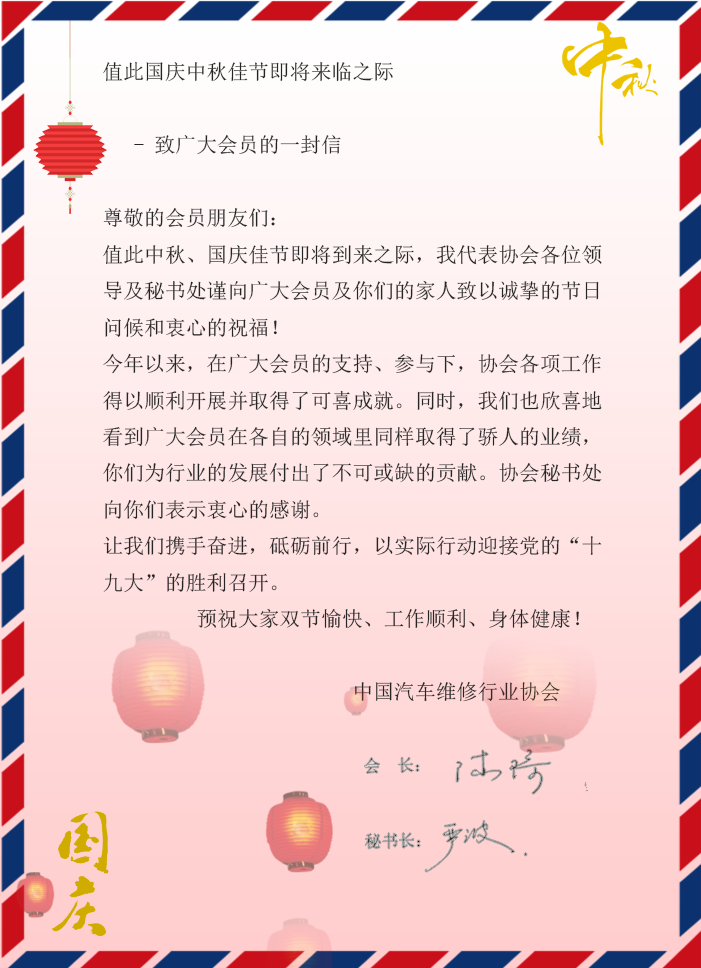 中國汽車維修行業(yè)協(xié)會(huì)陳琦會(huì)長致廣大會(huì)員的節(jié)日賀信