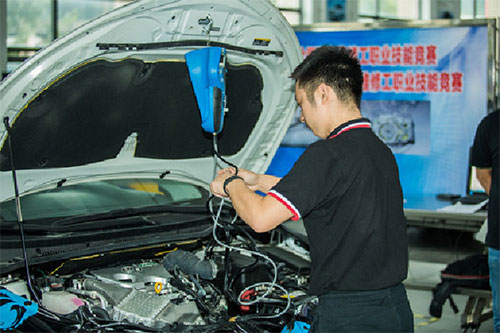 本次大賽共設(shè)三個(gè)項(xiàng)目,分別為汽車綜合故障診斷與排除和汽車空調(diào)系統(tǒng)維修、汽車維修業(yè)務(wù)接待、車身修復(fù)(鈑金)。每個(gè)項(xiàng)目均分為理論考試和實(shí)際操作兩項(xiàng)。三個(gè)項(xiàng)目的理論考試均采用機(jī)考形式,試卷賽前隨機(jī)生成;實(shí)操競(jìng)賽都安排了觀摩區(qū),方便觀看。