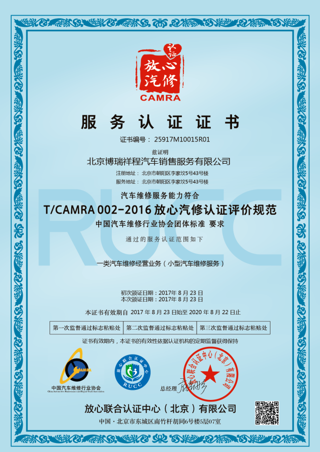 總經(jīng)理王秋桐寄語(yǔ):通過放心汽修服務(wù)認(rèn)證,促使博瑞祥程店服務(wù)品質(zhì)有了更大的提升,通過持之以恒、堅(jiān)持不懈的努力,全面提升了汽車維修行業(yè)的整體服務(wù)水平,樹立良好社會(huì)形象,為客戶提供更加誠(chéng)信透明、經(jīng)濟(jì)優(yōu)質(zhì)、便捷周到、滿意度高的汽車維修服務(wù),放心汽修將讓汽車售后維修客戶更有信心!