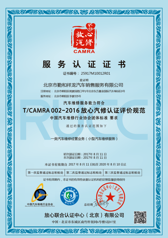 放心汽修認(rèn)證證書