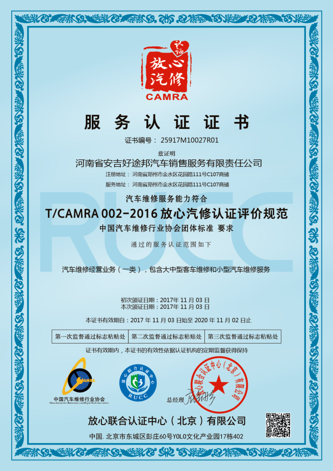 放心汽修認(rèn)證證書