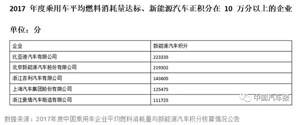 相反,部分自主品牌車企的新能源積分則“供應(yīng)充足”。以2017年度乘用車平均燃料消耗量達(dá)標(biāo)、新能源汽車積分在10萬分以上的5家企業(yè)為例,有4家都是自主品牌車企。事實(shí)上,為應(yīng)對“雙積分”政策,通過多種途徑拓展了自身的新能源汽車業(yè)務(wù),使新能源汽車的積分達(dá)到了一定規(guī)模。