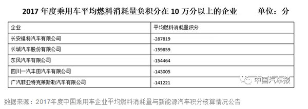 在56家平均燃料消耗量不達(dá)標(biāo)的乘用車企中,同樣有5家企業(yè)的平均燃料消耗量負(fù)積分在10萬分以上。其中長安福特汽車有限公司的平均燃料消耗量負(fù)積分接近29萬分,其他四家企業(yè)的負(fù)積分都在14萬~15萬分之間。5家企業(yè)平均燃料消耗量產(chǎn)生的負(fù)積分累計(jì)超過88.6萬分,超出燃料消耗量負(fù)積分總量的一半,同時(shí)也超出新能源汽車正積分前5名企業(yè)的累計(jì)分?jǐn)?shù)。