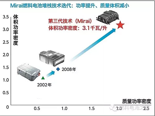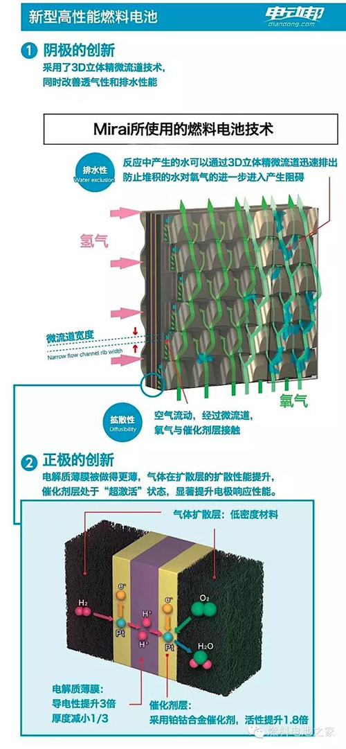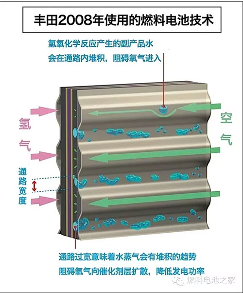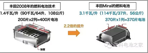 豐田Mirai搭載的燃料電池堆棧是由370片薄片燃料電池組成的,因此被稱為“堆棧”,一共可以輸出114千瓦的發(fā)電功率。此前我們也分析了大眾集團(tuán)的燃料電池技術(shù),結(jié)構(gòu)基本類似。豐田的燃料電池堆棧經(jīng)歷了十幾年的技術(shù)優(yōu)化,形成了自己的特色結(jié)構(gòu),比如3D立體微流道技術(shù),通過更好地排出副產(chǎn)物水,讓更多空氣流入,有效改善了發(fā)電效率。所以整個堆棧的發(fā)電效率達(dá)到了世界先進(jìn)水平,達(dá)到了3.1千瓦/升,比2008年豐田的技術(shù)整整提升了2.2倍。