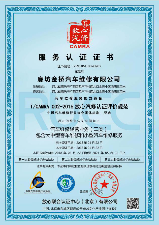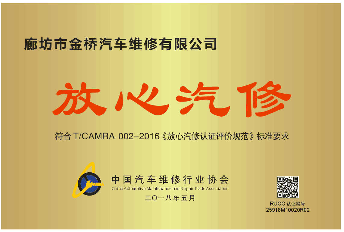 放心汽修認(rèn)證證書